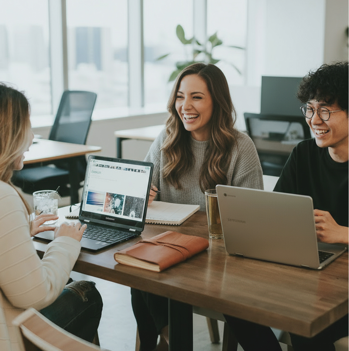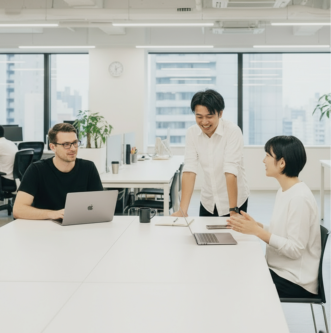 私たちの働き方は、常にプロジェクト単位での協働が基本です。社員同士の距離は近く、互いに意見を出し合いながら進めていくスタイルが確立されています。社内には日本人社員だけでなく、多国籍の講師やスタッフが在籍しており、日常的に異文化に触れながら働くことが可能です。多様な価値観に刺激を受け、自分自身の視野や考え方が自然と広がっていく職場であり、挑戦を応援し合う風土があるからこそ風通しも良く、前向きに取り組める環境が整っています。